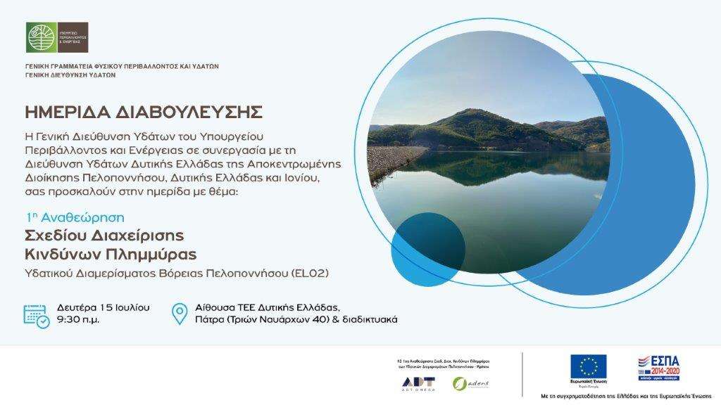 Ημερίδα Διαβούλευσης με θέμα: «1η Αναθεώρηση Σχεδίου Διαχείρισης Κινδύνων Πλημμύρας του Υδατικού Διαμερίσματος Βόρειας Πελοποννήσου (ΕL02)»