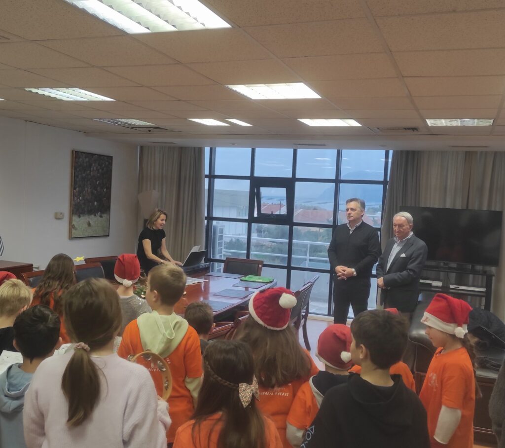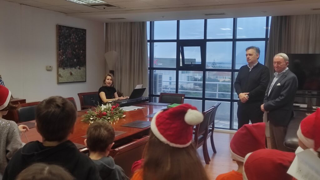 Με την καθοδήγηση της μουσικού κ. Έφης Κόγκου τα παιδιά γέμισαν τον χώρο με χαρούμενες φωνές και γέλια, τραγούδησαν με την ψυχή τους και προσέφεραν στον Γραμματέα Χριστουγεννιάτικη κάρτα με ευχές.